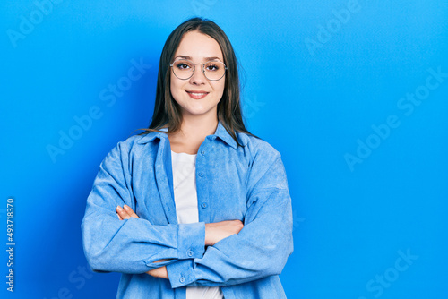 Young hispanic girl wearing casual clothes and glasses happy face smiling with crossed arms looking at the camera. positive person.