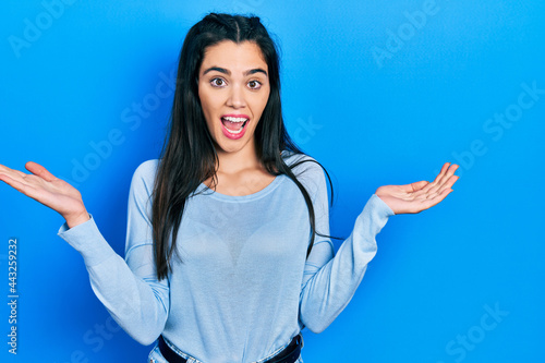 Young hispanic girl wearing casual clothes celebrating victory with happy smile and winner expression with raised hands