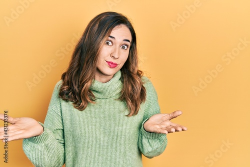Young hispanic girl wearing casual clothes clueless and confused expression with arms and hands raised. doubt concept.