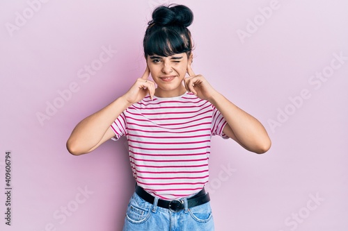 Young hispanic girl wearing casual clothes covering ears with fingers with annoyed expression for the noise of loud music. deaf concept.