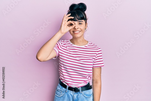 Young hispanic girl wearing casual clothes doing ok gesture with hand smiling, eye looking through fingers with happy face.