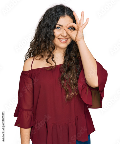 Young hispanic girl wearing casual clothes doing ok gesture with hand smiling, eye looking through fingers with happy face.
