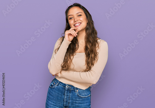 Young hispanic girl wearing casual clothes looking confident at the camera with smile with crossed arms and hand raised on chin. thinking positive.