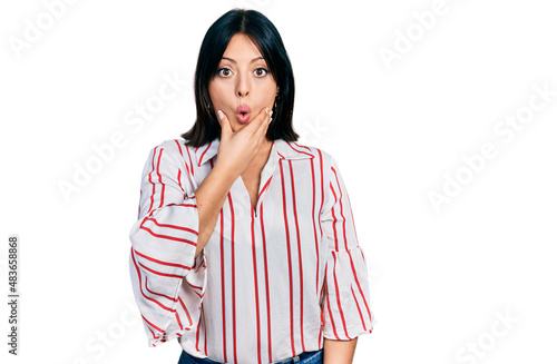 Young hispanic girl wearing casual clothes looking fascinated with disbelief, surprise and amazed expression with hands on chin