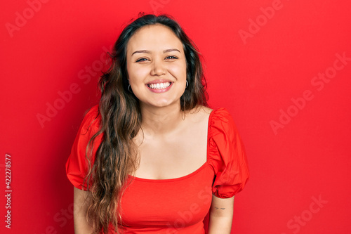 Young hispanic girl wearing casual clothes looking positive and happy standing and smiling with a confident smile showing teeth