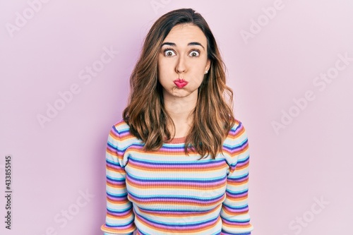 Young hispanic girl wearing casual clothes puffing cheeks with funny face. mouth inflated with air, crazy expression.