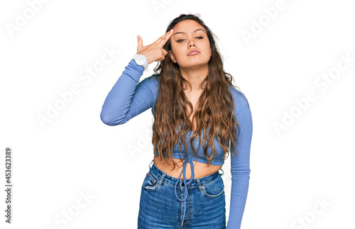 Young hispanic girl wearing casual clothes shooting and killing oneself pointing hand and fingers to head like gun, suicide gesture.