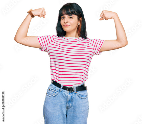 Young hispanic girl wearing casual clothes showing arms muscles smiling proud. fitness concept.