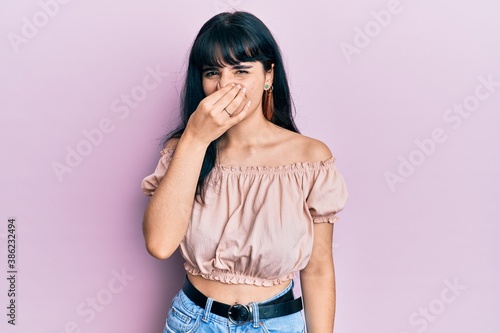 Young hispanic girl wearing casual clothes smelling something stinky and disgusting, intolerable smell, holding breath with fingers on nose. bad smell