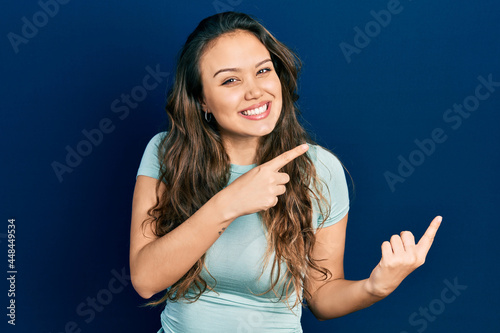 Young hispanic girl wearing casual clothes smiling and looking at the camera pointing with two hands and fingers to the side.