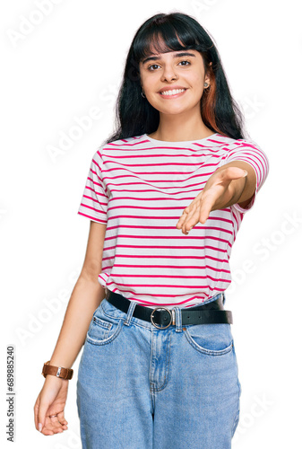 Young hispanic girl wearing casual clothes smiling cheerful offering palm hand giving assistance and acceptance.
