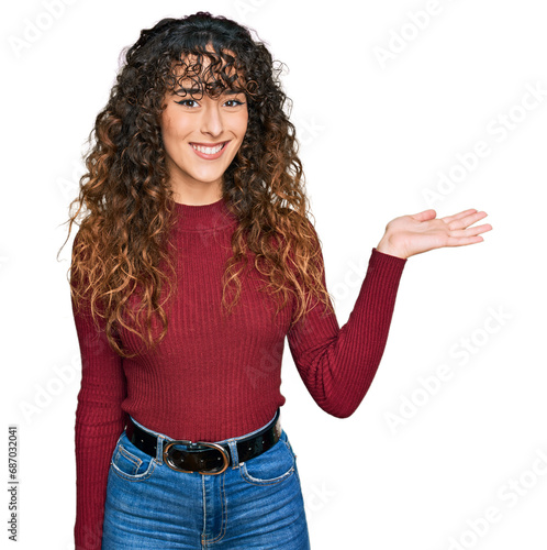 Young hispanic girl wearing casual clothes smiling cheerful presenting and pointing with palm of hand looking at the camera.