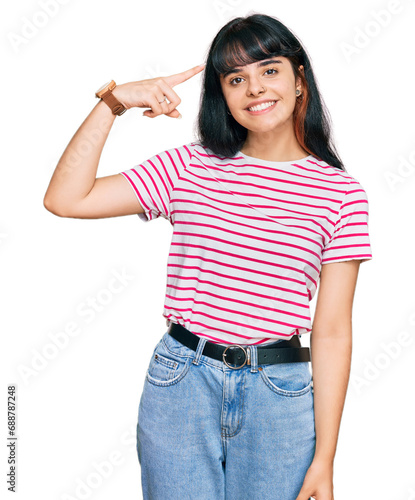 Young hispanic girl wearing casual clothes smiling pointing to head with one finger, great idea or thought, good memory
