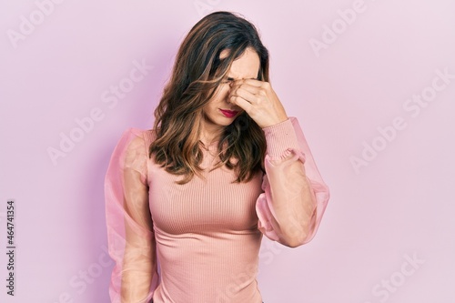 Young hispanic girl wearing casual clothes tired rubbing nose and eyes feeling fatigue and headache. stress and frustration concept.