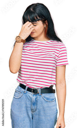 Young hispanic girl wearing casual clothes tired rubbing nose and eyes feeling fatigue and headache. stress and frustration concept.