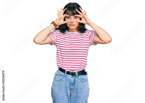 Young hispanic girl wearing casual clothes trying to open eyes with fingers, sleepy and tired for morning fatigue