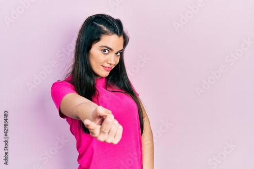 Young hispanic girl wearing casual pink t shirt beckoning come here gesture with hand inviting welcoming happy and smiling