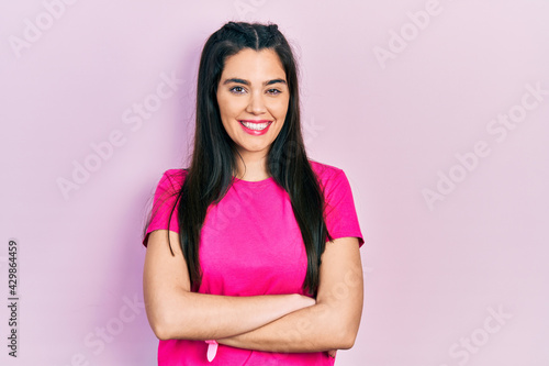 Young hispanic girl wearing casual pink t shirt happy face smiling with crossed arms looking at the camera. positive person.
