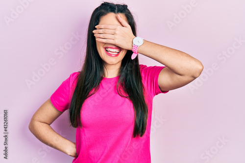Young hispanic girl wearing casual pink t shirt smiling and laughing with hand on face covering eyes for surprise. blind concept.