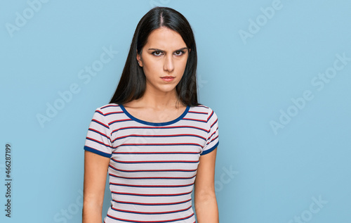 Young hispanic girl wearing casual striped t shirt skeptic and nervous, frowning upset because of problem. negative person.
