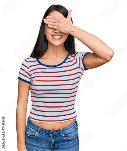 Young hispanic girl wearing casual striped t shirt smiling and laughing with hand on face covering eyes for surprise. blind concept.
