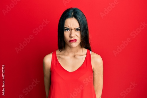 Young hispanic girl wearing casual style with sleeveless shirt skeptic and nervous, frowning upset because of problem. negative person.