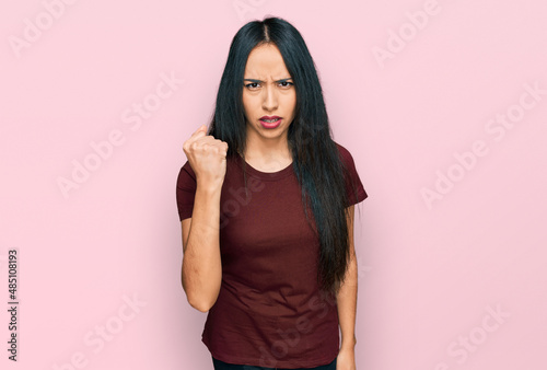 Young hispanic girl wearing casual t shirt angry and mad raising fist frustrated and furious while shouting with anger. rage and aggressive concept.