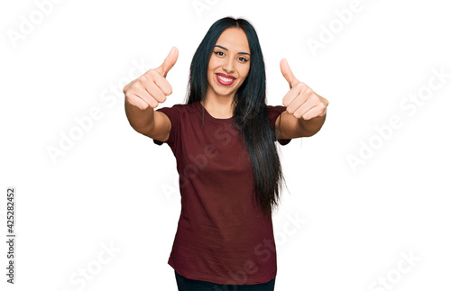 Young hispanic girl wearing casual t shirt approving doing positive gesture with hand, thumbs up smiling and happy for success. winner gesture.