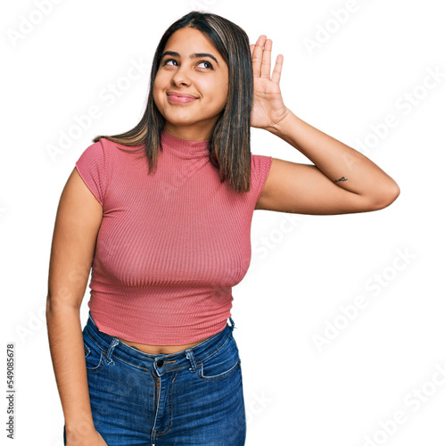 Young hispanic girl wearing casual t shirt smiling with hand over ear listening an hearing to rumor or gossip. deafness concept.