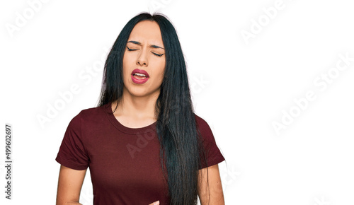 Young hispanic girl wearing casual t shirt with hand on stomach because nausea, painful disease feeling unwell. ache concept.