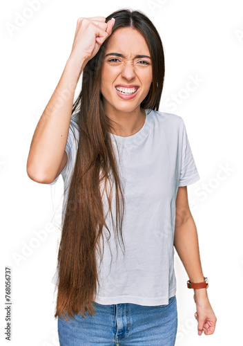 Young hispanic girl wearing casual white t shirt angry and mad raising fist frustrated and furious while shouting with anger. rage and aggressive concept.