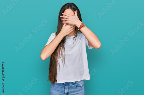 Young hispanic girl wearing casual white t shirt covering eyes and mouth with hands, surprised and shocked. hiding emotion