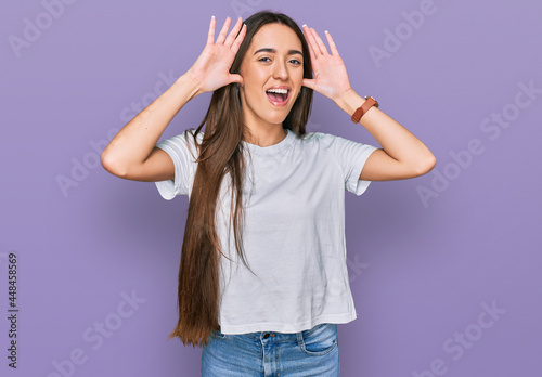 Young hispanic girl wearing casual white t shirt smiling cheerful playing peek a boo with hands showing face. surprised and exited