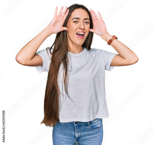 Young hispanic girl wearing casual white t shirt smiling cheerful playing peek a boo with hands showing face. surprised and exited