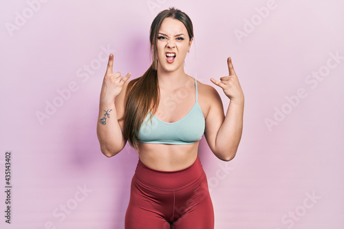 Young hispanic girl wearing sportswear shouting with crazy expression doing rock symbol with hands up. music star. heavy concept.