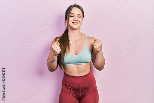 Young hispanic girl wearing sportswear very happy and excited doing winner gesture with arms raised, smiling and screaming for success. celebration concept.