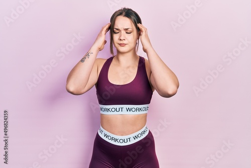 Young hispanic girl wearing sportswear with hand on head, headache because stress. suffering migraine.