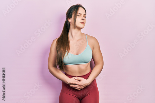 Young hispanic girl wearing sportswear with hand on stomach because nausea, painful disease feeling unwell. ache concept.