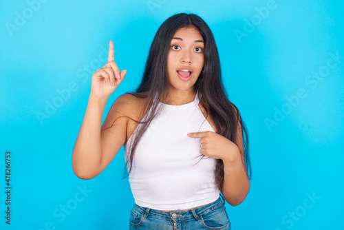 Young hispanic girl wearing tank top over blue background says: wow how exciting it is, has amazed expression, indicates something. One hand on her chest and pointing with other hand.