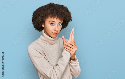 Young hispanic girl wearing wool winter sweater holding symbolic gun with hand gesture, playing killing shooting weapons, angry face
