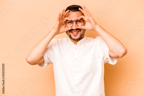 Young hispanic man isolated on beige background excited keeping ok gesture on eye.