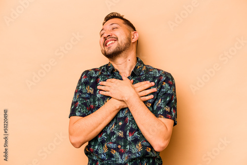 Young hispanic man isolated on beige background laughing keeping hands on heart, concept of happiness.
