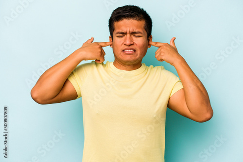 Young hispanic man isolated on blue background covering ears with fingers, stressed and desperate by a loudly ambient.