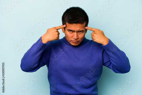 Young hispanic man isolated on blue background focused on a task, keeping forefingers pointing head.