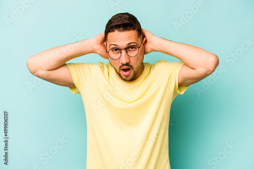 Young hispanic man isolated on blue background screaming, very excited, passionate, satisfied with something.