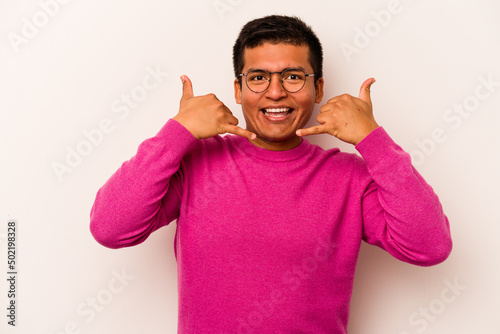 Young hispanic man isolated on white background showing a mobile phone call gesture with fingers.