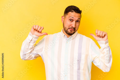 Young hispanic man isolated on yellow background feels proud and self confident, example to follow.