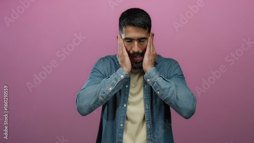 Young hispanic man looking stressed with his hands on his face, wearing a denim shirt against a pink isolated background.