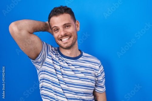 Young hispanic man standing over blue background smiling confident touching hair with hand up gesture, posing attractive and fashionable