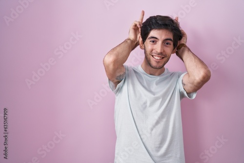 Young hispanic man standing over pink background posing funny and crazy with fingers on head as bunny ears, smiling cheerful